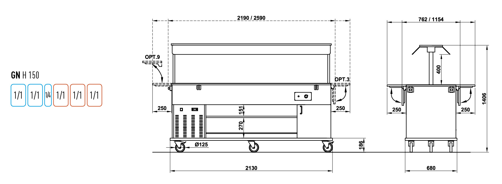 fahrbares Buffet mit gekühlter und Bain-Marie Wanne, Kapazität : 2,5 GN + 3 x 1/1 GN 150 mm, lieferbar in 16 verschiedenen Dekoren3.290,00 €*