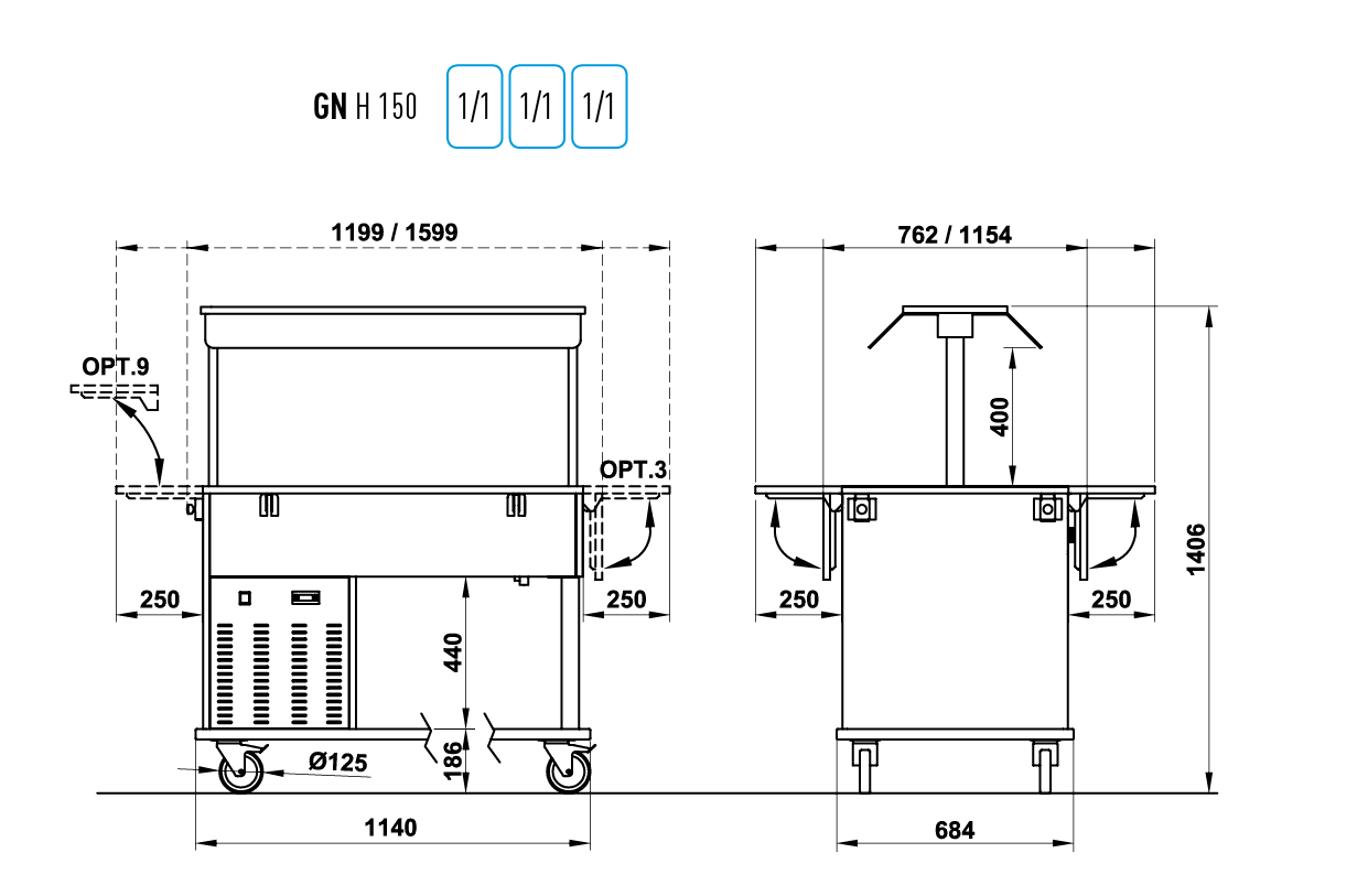 - Kapazität 3 x 1/1 GN 150 mm tief