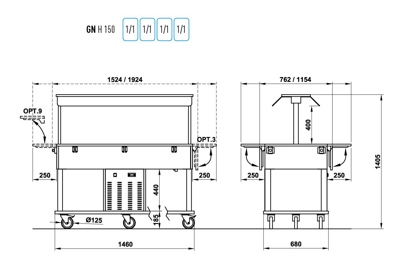 - Kapazität 4 x 1/1 GN 150 mm tief