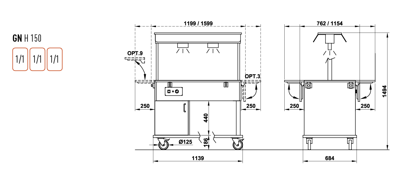 - Kapazität 3 x 1/1 GN 150 mm Tiefe
