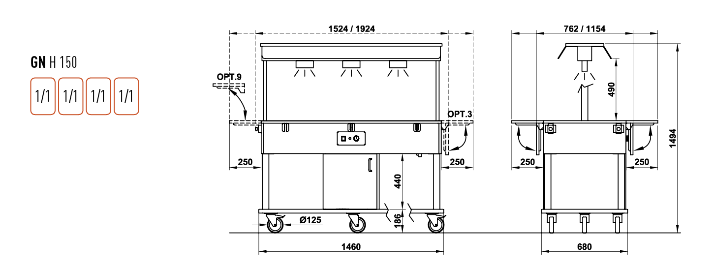 - Kapazität 4 x 1/1 GN 150 mm Tiefe